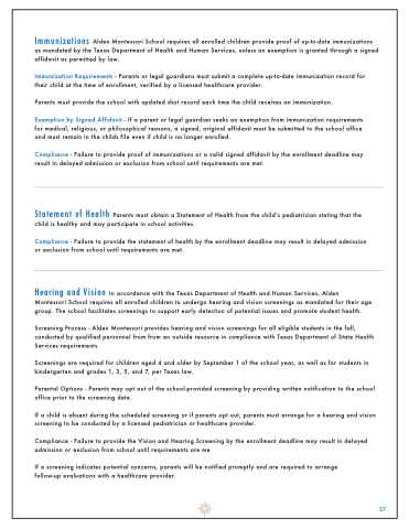 Immunizations Alden Montessori School requires all enrolled children provide proof of up-to-date immunizations as mandated by the Texas Department of Health and Human Services, unless an exemption is granted through a signed affidavit as permitted by law.