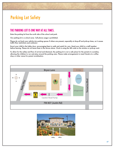 To allow for the safety and flow of arrival and dismissal, the parking lot is not a safe place for the parents to socialize, allowing the children to run and play around the parking area. Please make arrangements to meet friends at a coffee shop or other venue for parent socialization.