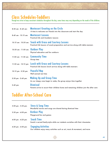 Though we strive to keep consistent schedules throughout the day, some times may very depending on the needs of the children.