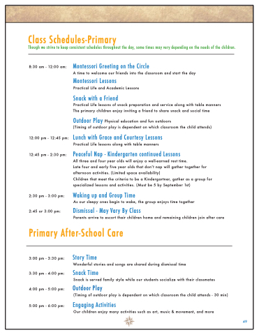 Practical Life lessons of snack preparation and service along with table manners The primary children enjoy inviting a friend to share snack and social time