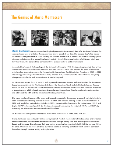 Maria Montessori was an extraordinarily gifted person with the scholarly bent of a Madame Curie and the compassionate soul of a Mother Teresa, and was always ahead of her time. She became Italyʼs first female doctor when she graduated in 1896. Initially she focused on the care of childrenʼs bodies and their physical ailments and diseases. Her natural intellectual curiosity then led to an exploration of childrenʼs minds and how they learn. She believed that environment was a major factor in child development.