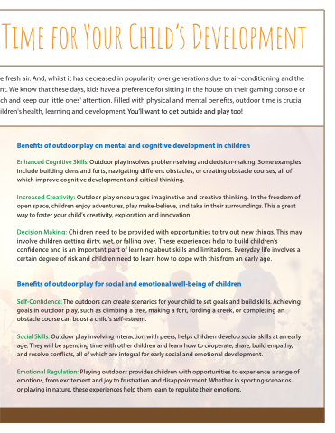Social Skills: Outdoor play involving interaction with peers, helps children develop social skills at an early age. They will be spending time with other children and learn how to cooperate, share, build empathy, and resolve conflicts, all of which are integral for early social and emotional development.