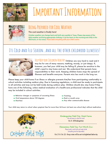 Oct. 21 & Oct. 22 - Group rosters will be sent via brightwheel before trip