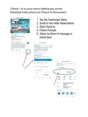Check – In to your resort before you arrive Detailed instructions on Check-In document 1. Tap the Hamburger Menu 2. Scroll to find Hotel Reservations 3. Start Check-In 4. Follow Prompts 5. Watch for Room # message or check back