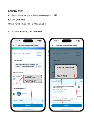 STEP BY STEP 8. Select everyone you will be purchasing the LLMP for TAP Continue ONLY PURCHASE FOR 3 AND OLDER 9. Subtotal appears, TAP Continue Subtotal before tax Select ALL CONTINUE CONTINUE