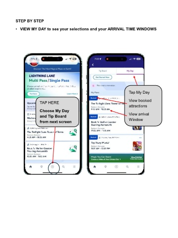 STEP BY STEP • VIEW MY DAY to see your selections and your ARRIVAL TIME WINDOWS Tap My Day TAP HERE View booked attractions Choose My Day and Tip Board View arrival from next screen Window
