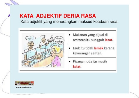 RASA DERIA Kata adjektif yang menerangkan maksud keadaan rasa. ADJEKTIF KATA ADJEKTIF DERIA RASA KATA www.saujana.sg