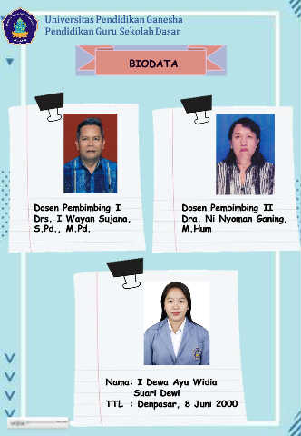 Universitas Pendidikan Ganesha Pendidikan Guru SekolahDasar BIODATA Dosen Pembimbing I Dosen Pembimbing II Drs. I Wayan Sujana, Dra. Ni Nyoman Ganing, S.Pd., M.Pd. M.Hum Nama: I Dewa Ayu Widia Suari Dewi TTL : Denpasar, 8 Juni 2000