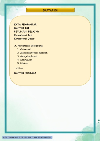 DAFTAR ISI KATA PENGANTAR DAFTAR ISI PETUNJUK BELAJAR Kompetensi Inti Kompetensi Dasar A. Persamaan Gelombang 1. Orientasi 2. Mengidentifkasi Masalah 3. Mengeksplorasi 4. Kesimpulan 5. Diskusi Latihan DAFTAR PUSTAKA