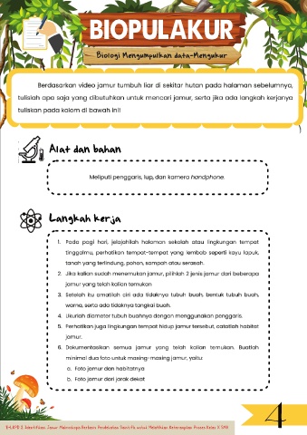 BIOPULAKUR BIPULAKUR Biologi Mengumpulkan data-Mengukur Alat dan bahan Langkah kerja 4 E-LKPD 2 Identifikasi Jamur Makroskopis Berbasis Pendekatan Saintifik untuk Melatihkan Keterampilan Proses Kelas X SMA