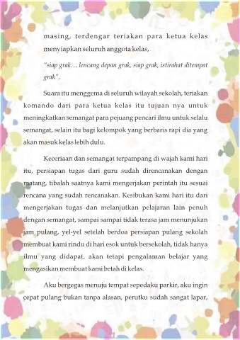 masing, terdengar teriakan para ketua kelas dan lagi hari ini ibu berjani memasakkan masakan kesukaanku,
