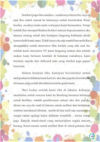 lihat  keindahan  kota  Jakarta  yang  begitu  megah,  tetapi  dari   ajak Rae untuk masuk ke kamarnya untuk beristirahat. Kami