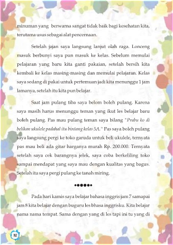 minuman yang  berwarna sangat tidak baik bagi kesehatan kita,                           sekolah.  Kita  hafalan  setelah  itu  kita  tulis  PR,  karena  banyak