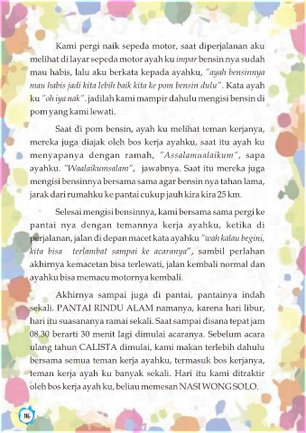 mau habis jadi kita lebih baik kita ke pom bensin dulu”. Kata ayah dan ucapan selamat untuk CALISTA. Kue ulang tahunpun