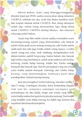 mau habis jadi kita lebih baik kita ke pom bensin dulu”. Kata ayah dan ucapan selamat untuk CALISTA. Kue ulang tahunpun