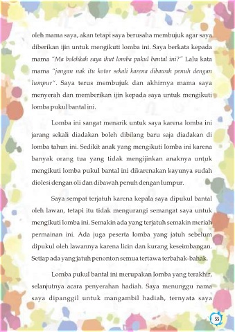 untuk ikut karena kelihatan susah akhirnya saya tidak ikut dan mama “Ma bolehkah saya ikut lomba pukul bantal ini?” Lalu kata