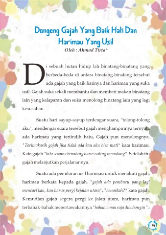 “iya kak" .”Ok sudah sampai mari kita turun". Suatu ada pemikiran usil harimau untuk menakuti gajah,