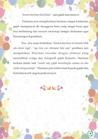 selalu mengerjainya". Harimau pun minta maaf kepada gajah dan