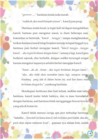 abadi, namun selalu harimau selalu mengalami kekalahan itu harimau, kancil mulai luluh hatinya, dan ia mau bersahabat