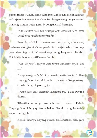 sangkuriang yang amat cepat. Dayang Sumbi berdo’a memohon “Wahai para dewa tolonglah hambamu ini.” Kata Dayang