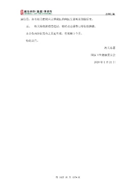 法律汇编 康信息,如有相关症状应立即就医并向医生说明近期旅行史。 五、 海关将依据疫情进展,实时动态调整口岸防控措施。 本公告内容自发布之日起生效,有效期 3 个月。 特此公告。 海关总署 国家卫生健康委员会 2020 年 1 月 24 日 第 1025 页 共 1354 页