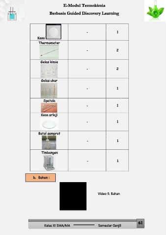 E-Modul Termokimia Berbasis Guided Discovery Learning - 1 Kasa Thermometer - 2 Gelas kimia - 2 Gelas ukur - 1 Spatula - 1 Kaca arloji - 1 Botol semprot - 1 Timbangan - 1 b. Bahan : Video 9. Bahan 61 Kelas XI SMA/MA Semester Ganjil