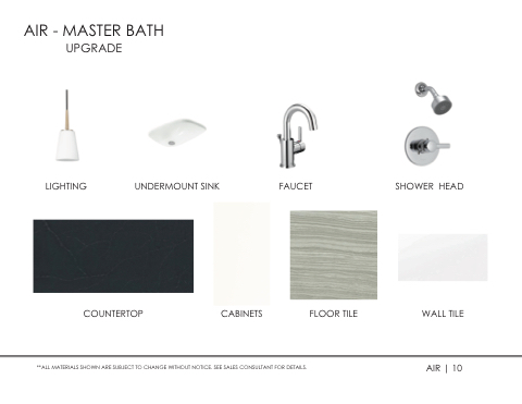 AIR - MASTER BATH UPGRADE LIGHTING UNDERMOUNT SINK FAUCET SHOWER HEAD COUNTERTOP CABINETS FLOOR TILE WALL TILE **ALL MATERIALS SHOWN ARE SUBJECT TO CHANGE WITHOUT NOTICE. SEE SALES CONSULTANT FOR DETAILS. AIR | 10