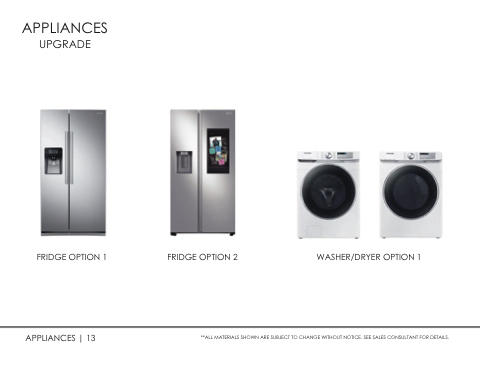 APPLIANCES UPGRADE FRIDGE OPTION 1 FRIDGE OPTION 2 WASHER/DRYER OPTION 1 APPLIANCES | 13 **ALL MATERIALS SHOWN ARE SUBJECT TO CHANGE WITHOUT NOTICE. SEE SALES CONSULTANT FOR DETAILS.