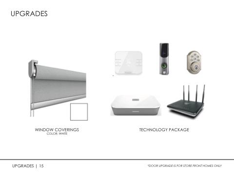 UPGRADES WINDOW COVERINGS TECHNOLOGY PACKAGE COLOR: WHITE UPGRADES | 15 *DOOR UPGRADE IS FOR STORE FRONT HOMES ONLY