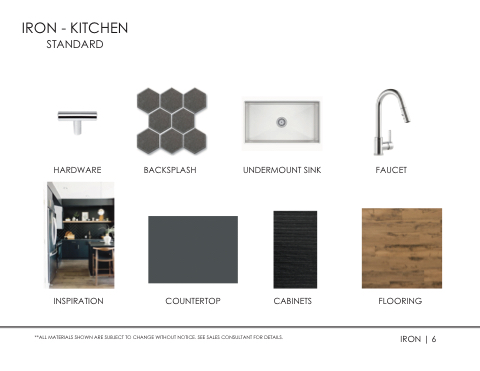 IRON - KITCHEN STANDARD HARDWARE BACKSPLASH UNDERMOUNT SINK FAUCET INSPIRATION COUNTERTOP CABINETS FLOORING **ALL MATERIALS SHOWN ARE SUBJECT TO CHANGE WITHOUT NOTICE. SEE SALES CONSULTANT FOR DETAILS. IRON | 6