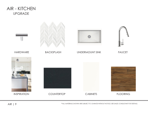 AIR - KITCHEN UPGRADE HARDWARE BACKSPLASH UNDERMOUNT SINK FAUCET INSPIRATION COUNTERTOP CABINETS FLOORING AIR | 9 **ALL MATERIALS SHOWN ARE SUBJECT TO CHANGE WITHOUT NOTICE. SEE SALES CONSULTANT FOR DETAILS.