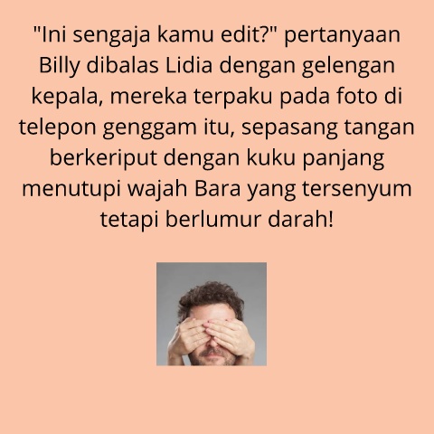"Ini sengaja kamu edit?" pertanyaan Billy dibalas Lidia dengan gelengan kepala, mereka terpaku pada foto di telepon genggam itu, sepasang tangan berkeriput dengan kuku panjang menutupi wajah Bara yang tersenyum tetapi berlumur darah!