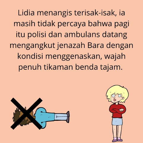 Lidia menangis terisak-isak, ia masih tidak percaya bahwa pagi itu polisi dan ambulans datang mengangkut jenazah Bara dengan kondisi menggenaskan, wajah penuh tikaman benda tajam.