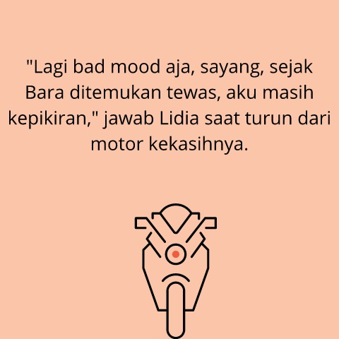 "Lagi bad mood aja, sayang, sejak Bara ditemukan tewas, aku masih kepikiran," jawab Lidia saat turun dari motor kekasihnya.