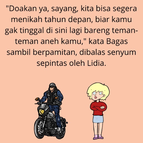 "Doakan ya, sayang, kita bisa segera menikah tahun depan, biar kamu gak tinggal di sini lagi bareng teman- teman aneh kamu," kata Bagas sambil berpamitan, dibalas senyum sepintas oleh Lidia.