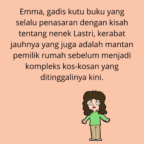Emma, gadis kutu buku yang selalu penasaran dengan kisah tentang nenek Lastri, kerabat jauhnya yang juga adalah mantan pemilik rumah sebelum menjadi kompleks kos-kosan yang ditinggalinya kini.