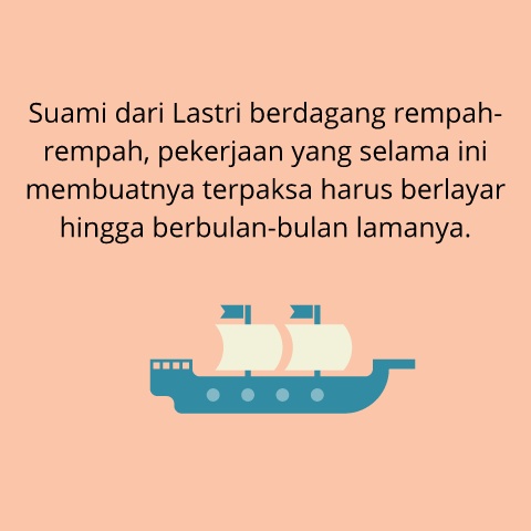 Suami dari Lastri berdagang rempah- rempah, pekerjaan yang selama ini membuatnya terpaksa harus berlayar hingga berbulan-bulan lamanya.
