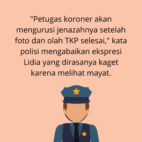 "Petugas koroner akan mengurusi jenazahnya setelah foto dan olah TKP selesai," kata polisi mengabaikan ekspresi Lidia yang dirasanya kaget karena melihat mayat.