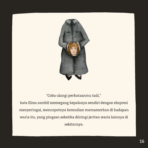 "Coba ulangi perkataanmu tadi," kata Elma sambil memegang kepalanya sendiri dengan ekspresi menyeringai, mencopotnya kemudian memamerkan di hadapan waria itu, yang pingsan seketika diiringi jeritan waria lainnya di sekitarnya. 16