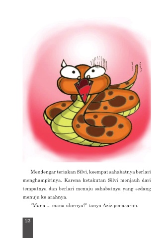 Mendengar teriakan Silvi, keempat sahabatnya berlari menghampirinya. Karena ketakutan Silvi menjauh dari tempatnya dan berlari menuju sahabatnya yang sedang menuju ke arahnya. “Mana ... mana ularnya?” tanya Aziz penasaran. 23 23 23