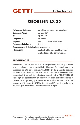 GEORESIN LX 30 es una emulsión de copolímero acrílico que forma