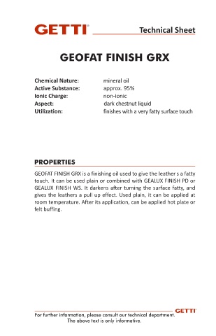 GEOFAT FINISH GRX is a finishing oil used to give the leather s a fatty