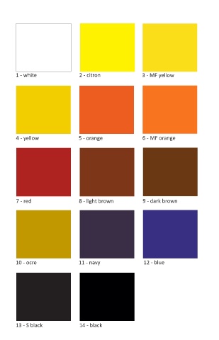 1 - white 2 - citron 3 - MF yellow 4 - yellow 5 - orange 6 - MF orange 7 - red 8 - light brown 9 - dark brown 10 - ocre 11 - navy 12 - blue 13 - S black 14 - black