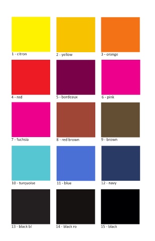 1 - citron 2 - yellow 3 - orange 4 - red 5 - bordeaux 6 - pink 7 - fuchsia 8 - red brown 9 - brown 10 - turquoise 11 - blue 12 - navy 13 - black bl 14 - black ro 15 - black