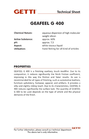 GEAFEEL G 400 is a finishing auxiliary, touch modifier. Due to its
