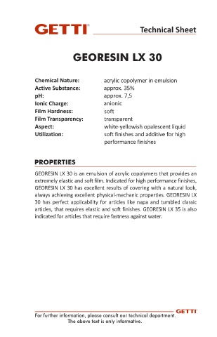 GEORESIN LX 30 is an emulsion of acrylic copolymers that provides an