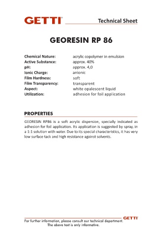 GEORESIN RP86 is a soft acrylic dispersion, specially indicated as