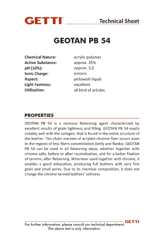 GEOTAN PB 54 is a resinous Retanning agent characterized by