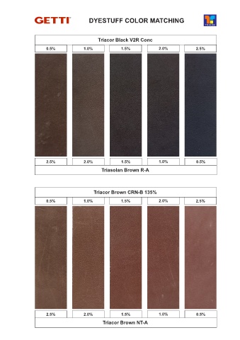 DYESTUFF COLOR MATCHING Triacor Black V2R Conc 0.5% 1.0% 1.5% 2.0% 2.5% 2.5% 2.0% 1.5% 1.0% 0.5% Triasolan Brown R-A Triacor Brown CRN-B 135% 0.5% 1.0% 1.5% 2.0% 2.5% 2.5% 2.0% 1.5% 1.0% 0.5% Triacor Brown NT-A
