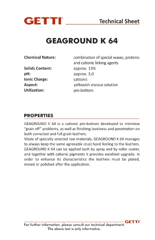 GEAGROUND K 64 is a cationic pre-bottom developed to minimize